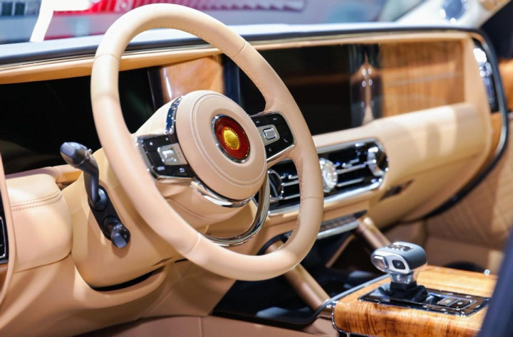 除了丹霞定制版,本次车展中红旗金葵花国礼标准定制版也进行了全面展示。作为品牌矩阵的核心车型,国礼承载着“国车基因、文化象征和仪式语言”三重角色,这种角色并非抽象表述,而是通过大量细节落地。例如外观采用前高后低“船式”姿态,呈昂首挺胸之势,象征自信从容;直瀑式格栅结合传承自红旗历史的“天圆地方”比例,通过方圆之间表达中国对“世界秩序”的理解。进入车内,可以看到大量从传统器具、建筑符号取材而来的人机设计:方向盘的“辅首衔环”源自中国传统大门门环,是身份与荣耀象征;控制旋钮以福建土楼为启发,寓意守望相助、凝聚向心力;山水音响罩则来自《千里江山图》的造型演绎,使声音体验带上视觉文化意境。“红旗将文化融入设备,使产品不仅是使用对象,更是体验文化的一部分”已在国礼中得到了充分证明。
