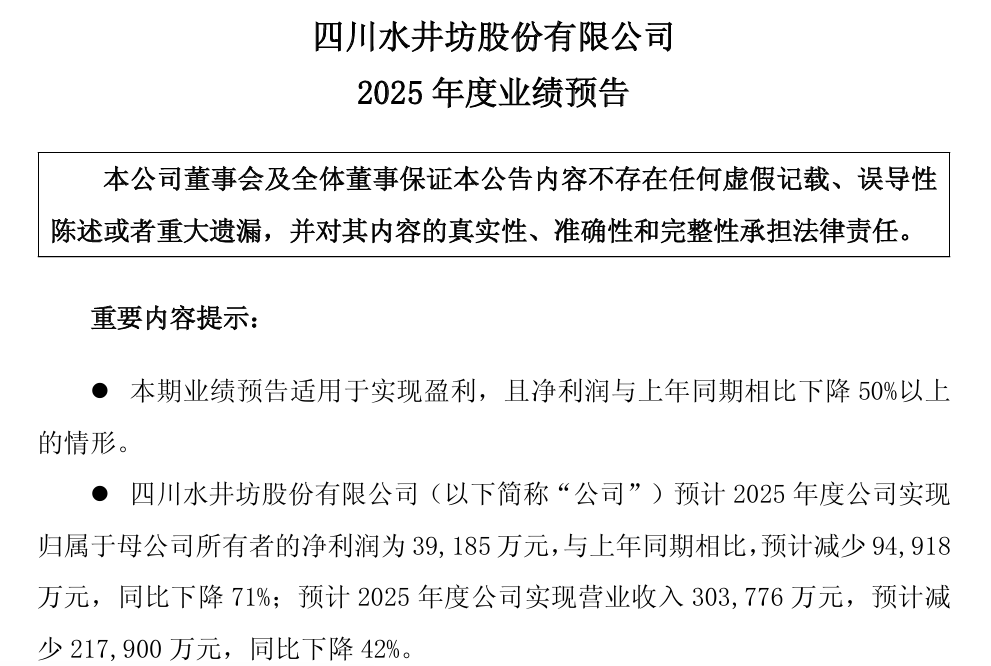 1月19日晚间,水井坊(600779)公告称,公司预计2025年度实现营业收入约30.38亿元,预计减少21.79亿元,同比下降42%;预计实现归属于母公司所有者的净利润约3.92亿元,与上年同期相比预计减少9.49亿元,同比下降71%。